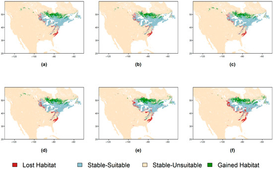 Sarracenia purpurea range change maps for six climate change scenarios: Shared Socioeconomic Pathway (SSP) 1–2.6, SSP 3–7.0, and SSP 5–8.5 by 2040 ((a–c), respectively) and 2100 ((d–f), respectively).