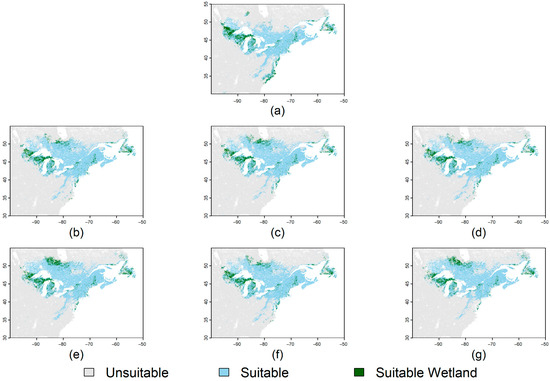 Intersection of binarized predicted suitable habitat with wetland land use classification. Suitable habitat is predicted across (a) the baseline climate, (b) Shared Socioeconomic Pathway (SSP) 1–2.6 by 2040, (c) Shared Socioeconomic Pathway (SSP) 1–2.6 by 2100, (d) SSP 3–7.0 by 2040, (e) SSP 3–7.0 by 2100, (f) SSP 5–8.5 by 2040, (g) SSP 5–8.5 by 2100. Suitable wetland habitat occurs where both predicted suitable habitat and wetland land use simultaneously co-occur.