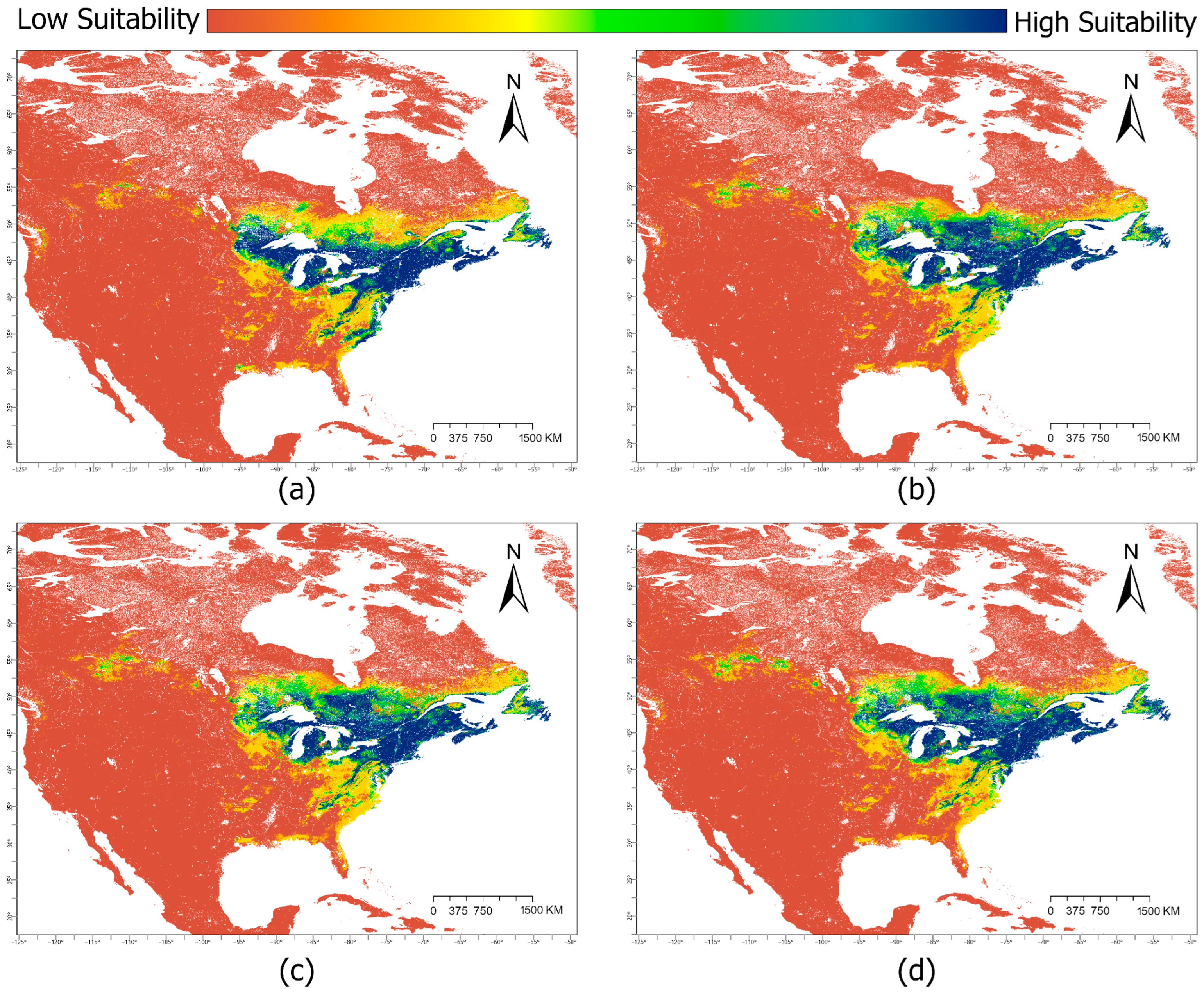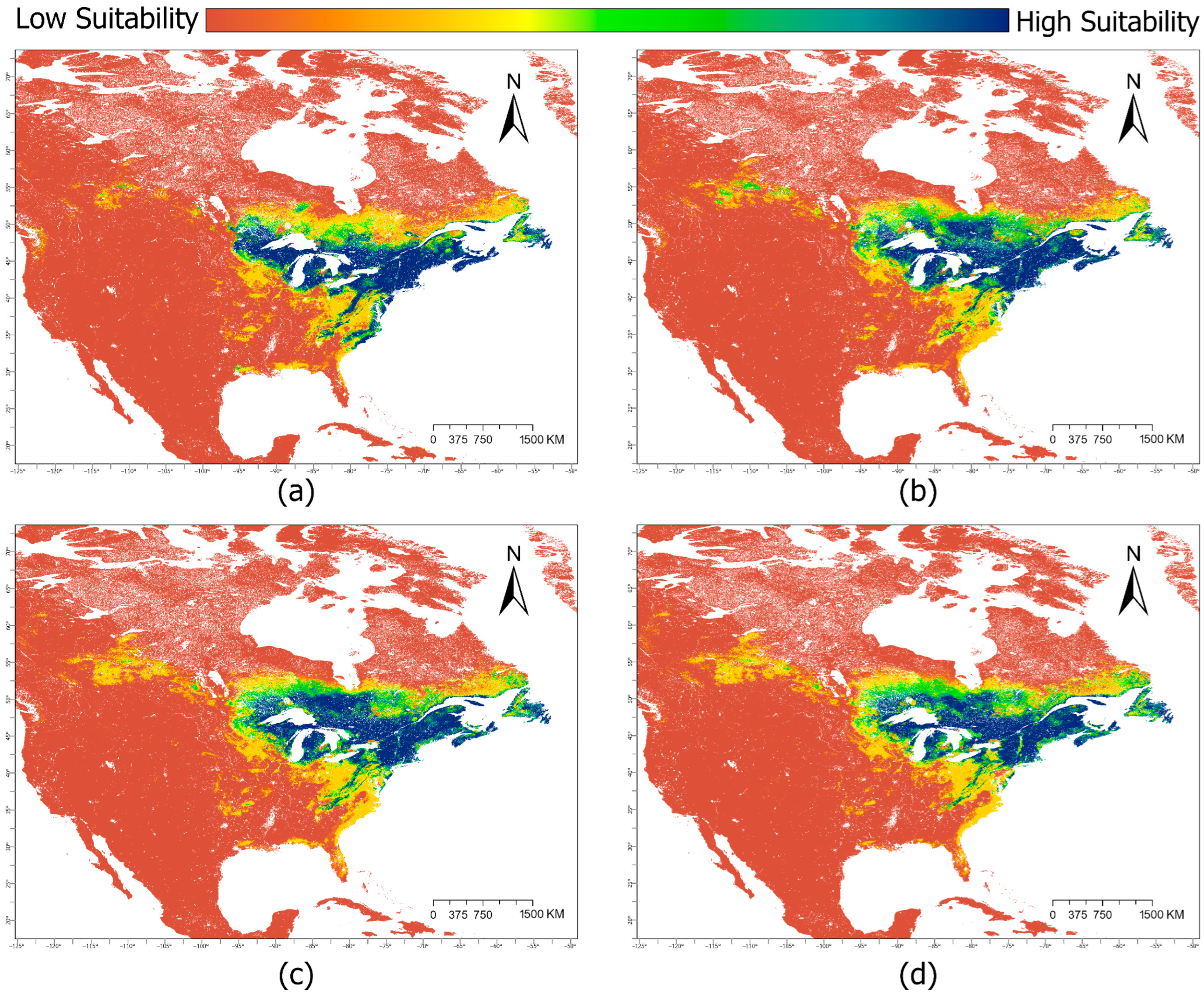 Figure 1. Suitable habitat of Sarracenia purpurea in North America for (a) the baseline climate scenario (climate normal period from 1970 to 2000) and three climate change scenarios projected to the year 2040: (b) Shared Socioeconomic Pathway (SSP) 1–2.6, (c) SSP 3–7.0, (d) SSP 5–8.5. Colors indicate habitat suitability.