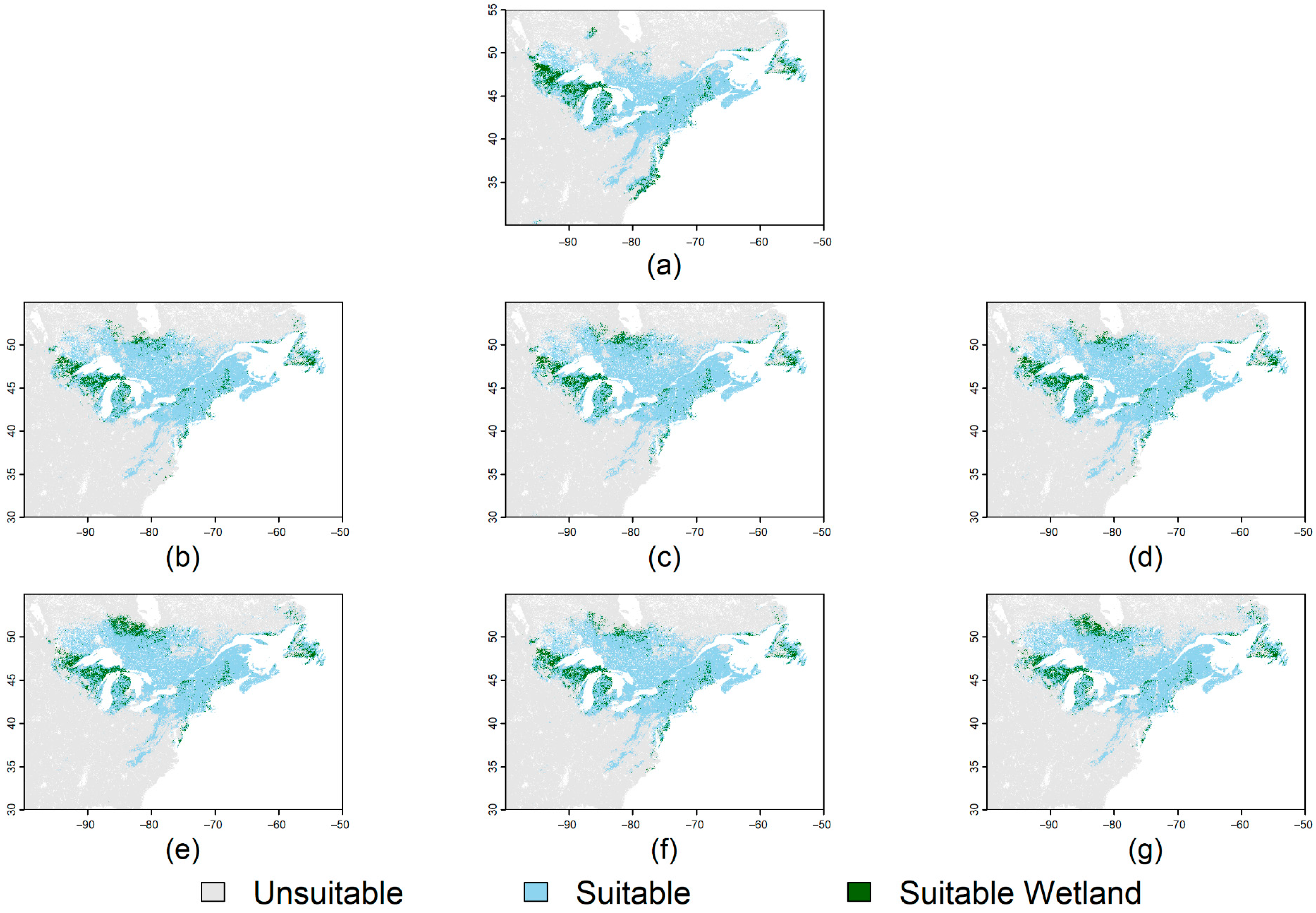 Figure 5. Intersection of binarized predicted suitable habitat with wetland land use classification. Suitable habitat is predicted across (a) the baseline climate, (b) Shared Socioeconomic Pathway (SSP) 1–2.6 by 2040, (c) Shared Socioeconomic Pathway (SSP) 1–2.6 by 2100, (d) SSP 3–7.0 by 2040, (e) SSP 3–7.0 by 2100, (f) SSP 5–8.5 by 2040, (g) SSP 5–8.5 by 2100. Suitable wetland habitat occurs where both predicted suitable habitat and wetland land use simultaneously co-occur.