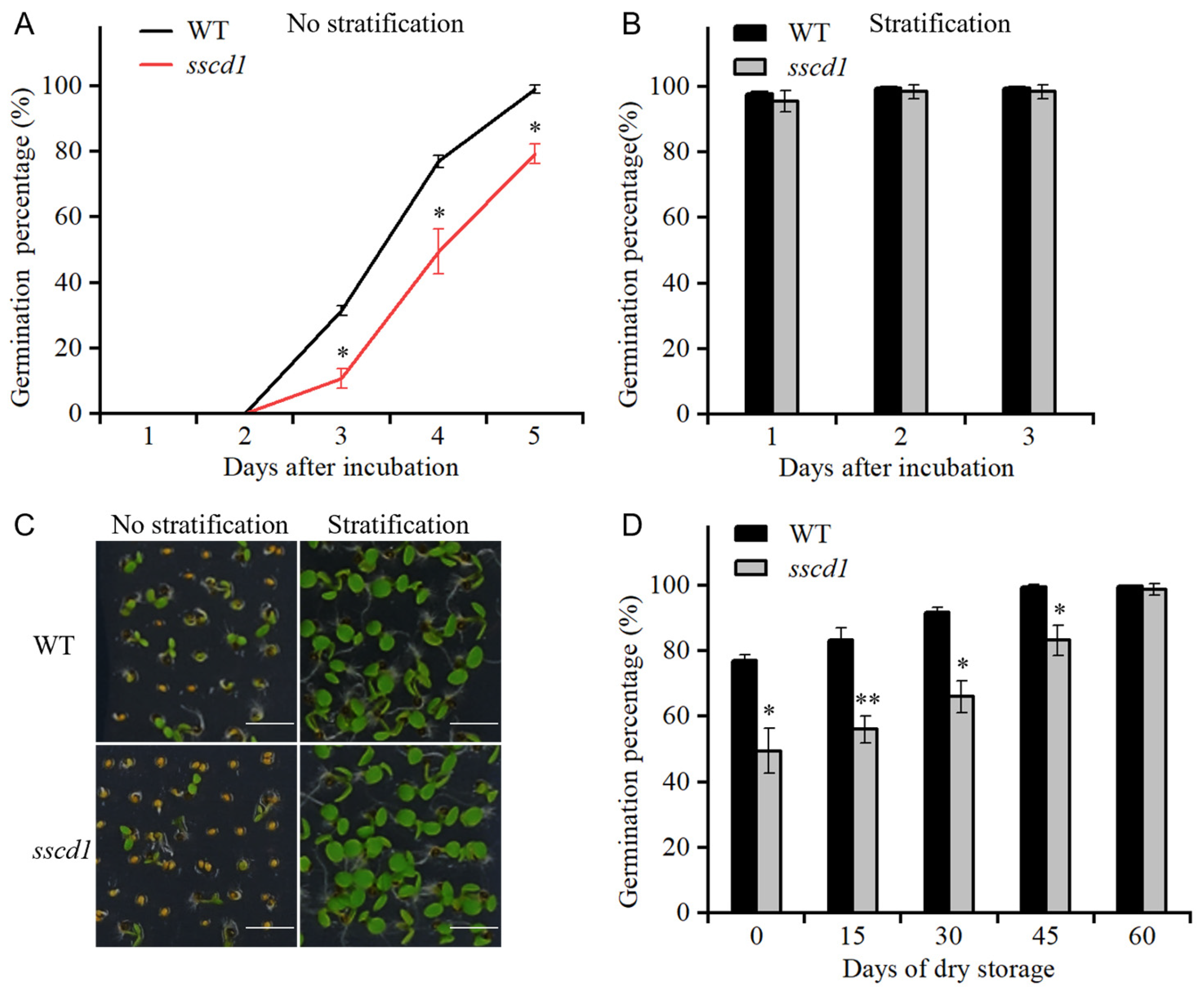 Figure 1. The sscd1 mutant exhibited increased seed dormancy. (A,B) Germination percentages of freshly harvested wild type (WT) and sscd1 seeds without (A) or with (B) stratification treatment. (C) Germination phenotypes of the seeds described in (A,B) on the 4th day after incubation at 23 °C. Scale bars = 2.78 mm. (D) Germination percentages scored four days after incubation, of WT and sscd1 seeds stored for the time indicated without stratification treatment. Data in (A,B,D) represent the mean ± standard error (SE) from three biological replicates. Seeds were pooled from at least 10 plants, and at least 50 seeds per genotype were used in each replicate. Asterisks represent significant differences between the WT and sscd1 seeds (t-test, * p < 0.05, ** p < 0.01).