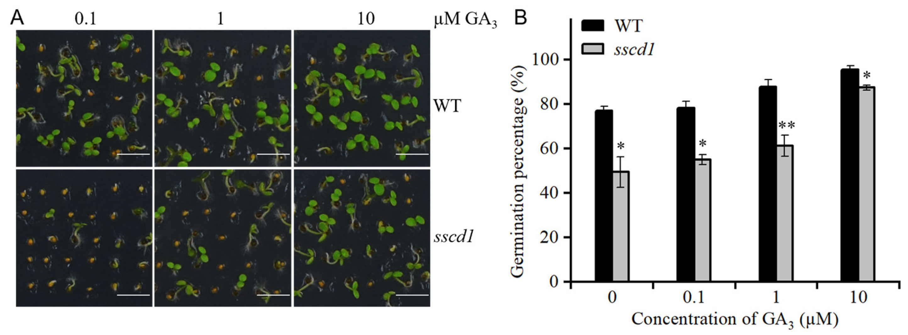 Figure 2. The sscd1 mutant showed reduced sensitivity to GA. (A) Germination phenotypes of freshly harvested WT and sscd1 seeds on the 4th day after incubation in the presence of different GA3 concentrations without stratification treatment. Scale bars = 2.78 mm. (B) Germination percentages of WT and sscd1 seeds described in (A). Data represent the mean ± SE from three biological replicates. Seeds were pooled from at least 10 plants, and at least 50 seeds per genotype were used in each replicate. Asterisks represent significant differences between the WT and sscd1 seeds (t-test, * p < 0.05, ** p < 0.01).