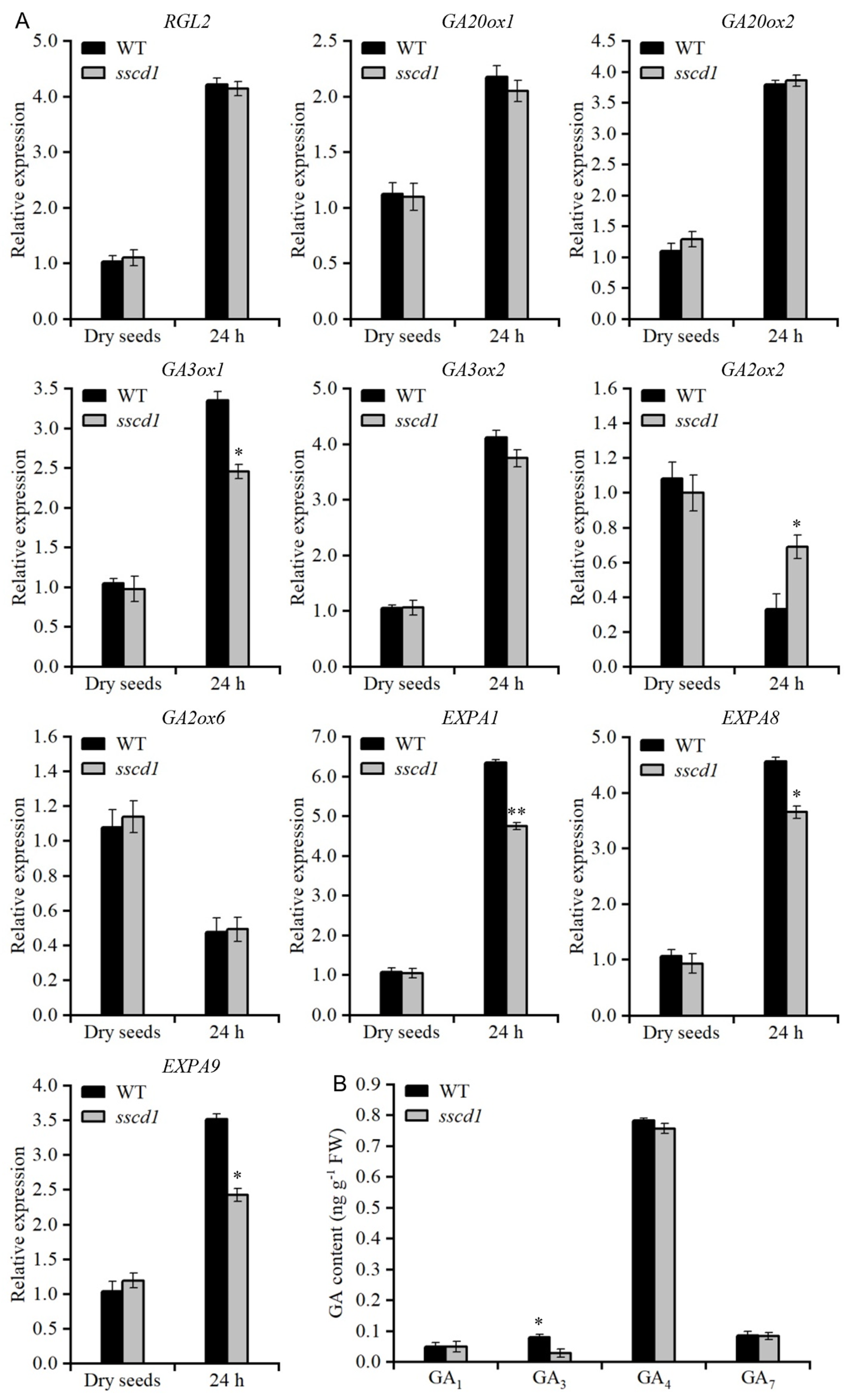 Figure 3. The sscd1 mutant showed decreased GA biosynthesis. (A) Relative expression of genes involved in GA signaling (RGL2), biosynthesis (GA20ox1, GA20ox2, GA3ox1, GA3ox2), catabolism (GA2ox2, GA2ox6), and cell wall extension (EXPA1, EXPA8, EXPA9) in freshly harvested dry seeds and seeds imbibed for 24 h on MS medium from WT and sscd1 plants. RGL2, RGA-LIKE 2. GA20ox1, GA20-oxidase 1. GA20ox2, GA20-oxidase 2. GA3ox1, GA3-oxidase 1. GA3ox2, GA3-oxidase 2. GA2ox2, GA2-oxidase 2. GA2ox6, GA2-oxidase 6. EXPA1, expansin A1. EXPA8, expansin A8. EXPA9, expansin A9. (B) GA1, GA3, GA4, and GA7 content in freshly harvested WT and sscd1 seeds imbibed for 24 h on MS medium. All data represent the mean ± SE from three biological replicates. Asterisks represent significant differences between the WT and sscd1 seeds (t-test, * p < 0.05, ** p < 0.01).