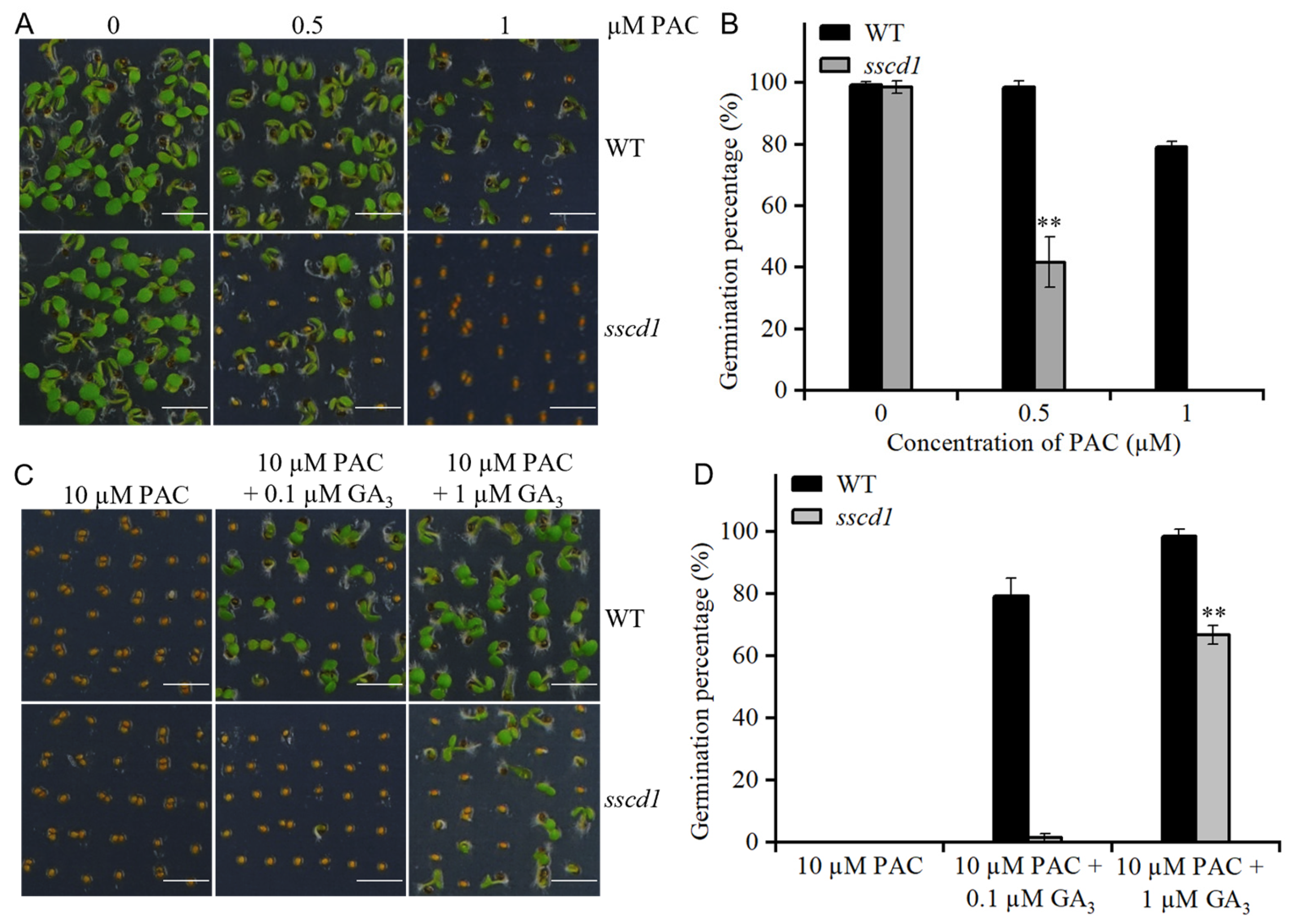 Figure 4. The sscd1 mutant showed increased sensitivity to paclobutrazol (PAC). (A) Germination phenotypes of WT and sscd1 seeds after 60 days of storage on the 4th day after stratification in the presence of different PAC concentrations. Scale bars = 2.78 mm. (B) Germination percentages of WT and sscd1 seeds described in (A). (C) Germination phenotypes of WT and sscd1 seeds on the 4th day after stratification in the presence of 10 µM PAC and 0.1 or 1 µM GA3. Scale bars = 2.78 mm. (D) Germination percentages of WT and sscd1 seeds described in (C). Data in (B,D) represent the mean ± SE from three biological replicates. Seeds were pooled from at least 10 plants, and at least 50 seeds per genotype were used in each replicate. Asterisks represent significant differences between the WT and sscd1 seeds (t-test, ** p < 0.01).