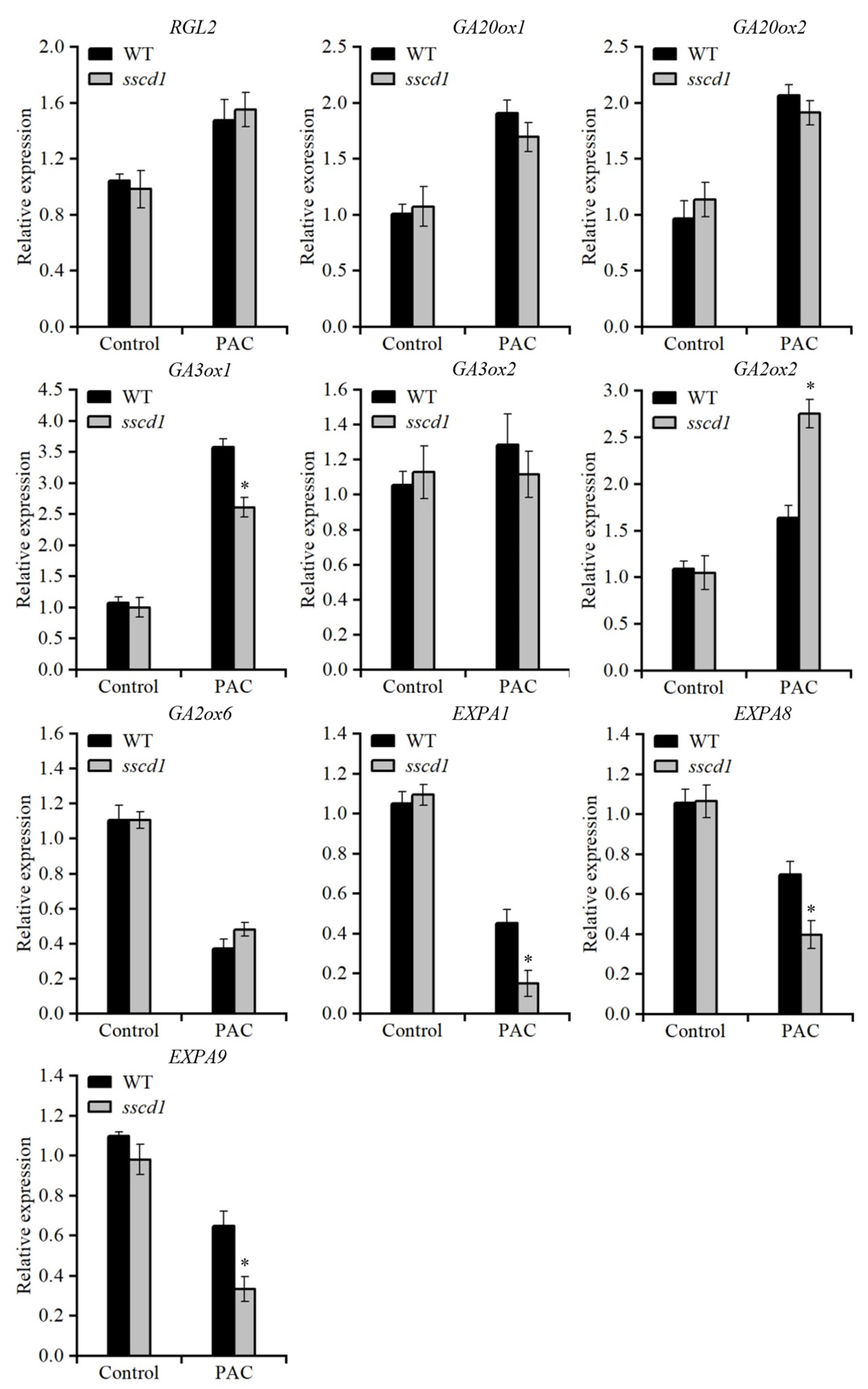 Figure 5. Expression analysis of genes involved in the GA pathway in WT and sscd1 seeds treated with paclobutrazol (PAC). Relative expression of genes involved in GA signaling (RGL2), biosynthesis (GA20ox1, GA20ox2, GA3ox1, GA3ox2), catabolism (GA2ox2, GA2ox6), and cell wall extension (EXPA1, EXPA8, EXPA9) in WT and sscd1 seeds imbibed for 12 h on MS medium without PAC (control) or with 10 µM PAC after stratification. RGL2, RGA-LIKE 2. GA20ox1, GA20-oxidase 1. GA20ox2, GA20-oxidase 2. GA3ox1, GA3-oxidase 1. GA3ox2, GA3-oxidase 2. GA2ox2, GA2-oxidase 2. GA2ox6, GA2-oxidase 6. EXPA1, expansin A1. EXPA8, expansin A8. EXPA9, expansin A9. Data represent the mean ± SE from three biological replicates. Asterisks represent significant differences between the WT and sscd1 seeds (t-test, * p < 0.05).