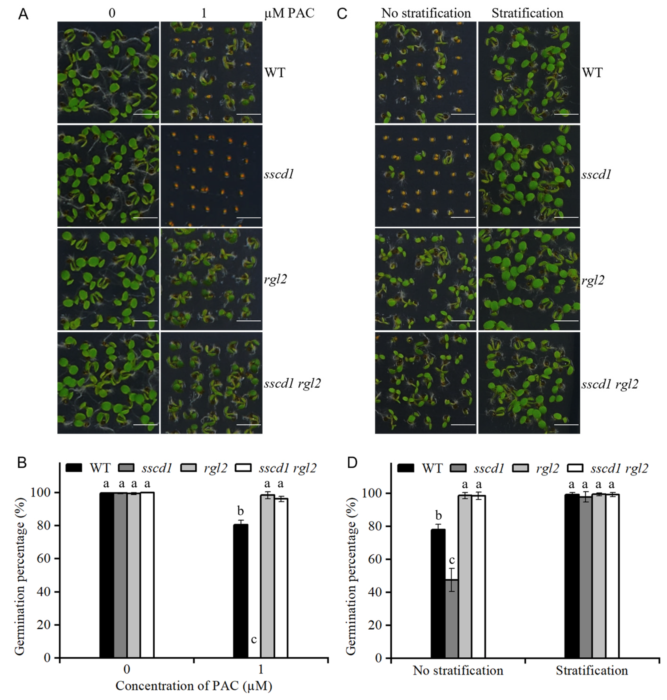 Figure 6. SSCD1 functions upstream of RGl2. (A) Germination phenotypes of WT, sscd1, rgl2, and sscd1 rgl2 seeds after 60 days of storage on the 4th day after stratification in the presence of 0 and 1 µM paclobutrazol (PAC). Scale bars = 2.78 mm. (B) Germination percentages of WT, sscd1, rgl2, and sscd1 rgl2 seeds described in (A). Data represent the mean ± SE from three biological replicates. Different letters indicate significant differences between the genotypes (Kruskal–Wallis test with Dunn’s post hoc test, p < 0.05). (C) Germination phenotypes of freshly harvested WT, sscd1, rgl2, and sscd1 rgl2 seeds on the 4th day after incubation without stratification treatment. Scale bars = 2.78 mm. (D) Germination percentages of WT, sscd1, rgl2, and sscd1 rgl2 seeds described in (C). Data represent the mean ± SE from three biological replicates. Different letters indicate significant differences between the genotypes (one-way analysis of variance [ANOVA] with Tukey’s post hoc test, p < 0.05). Seeds were pooled from at least 10 plants, and at least 50 seeds per genotype were used in each replicate.