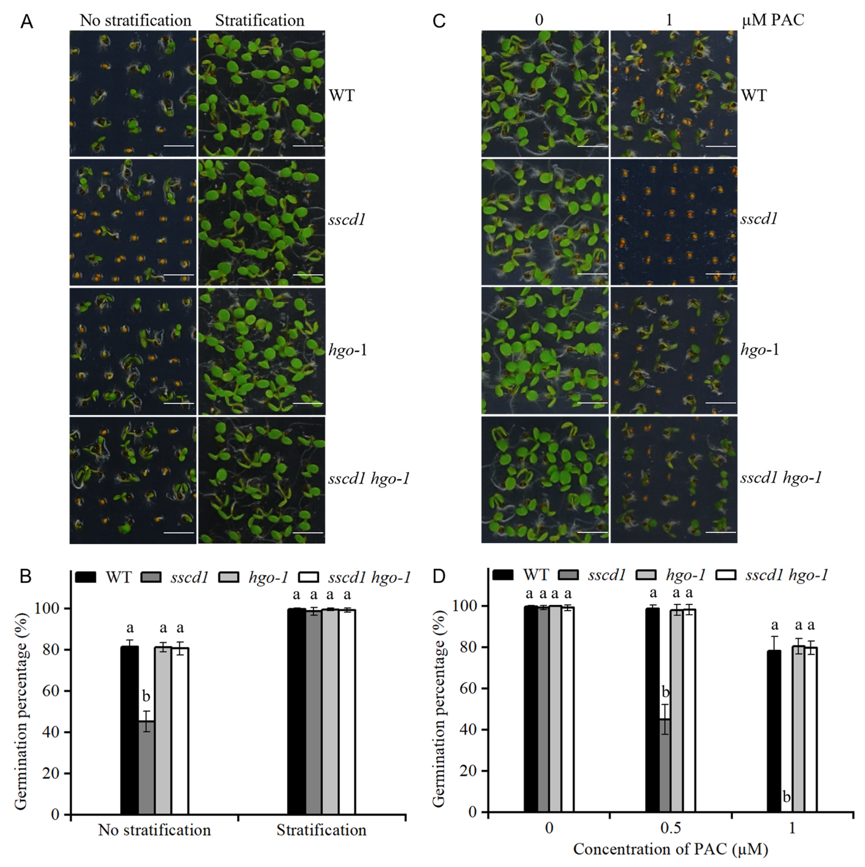 Figure 7. HGO mutation completely suppressed deep dormancy and paclobutrazol (PAC) hypersensitivity in sscd1 seeds. (A) Germination phenotypes of freshly harvested WT, sscd1, hgo-1, and sscd1 hgo-1 seeds on the 4th day after incubation without stratification treatment. Scale bars = 2.78 mm. (B) Germination percentages of WT, WT, sscd1, hgo-1, and sscd1 hgo-1 seeds described in (A). Data represent the mean ± SE from three biological replicates. Different letters indicate significant differences between the genotypes (one-way ANOVA with Tukey’s post hoc test, p < 0.05). (C) Germination phenotypes of WT, sscd1, hgo-1, and sscd1 hgo-1 seeds after 60 days of storage on the 4th day after stratification in the presence of 0 and 1 µM PAC. Scale bars = 2.78 mm. (D) Germination percentages of the WT, sscd1, hgo-1, and sscd1 hgo-1 seeds treated with different PAC concentrations. Data represent the mean ± SE from three biological replicates. Different letters indicate significant differences between the genotypes (Kruskal–Wallis with Dunn’s post hoc test, p < 0.05). Seeds were pooled from at least 10 plants, and at least 50 seeds per genotype were used in each replicate.