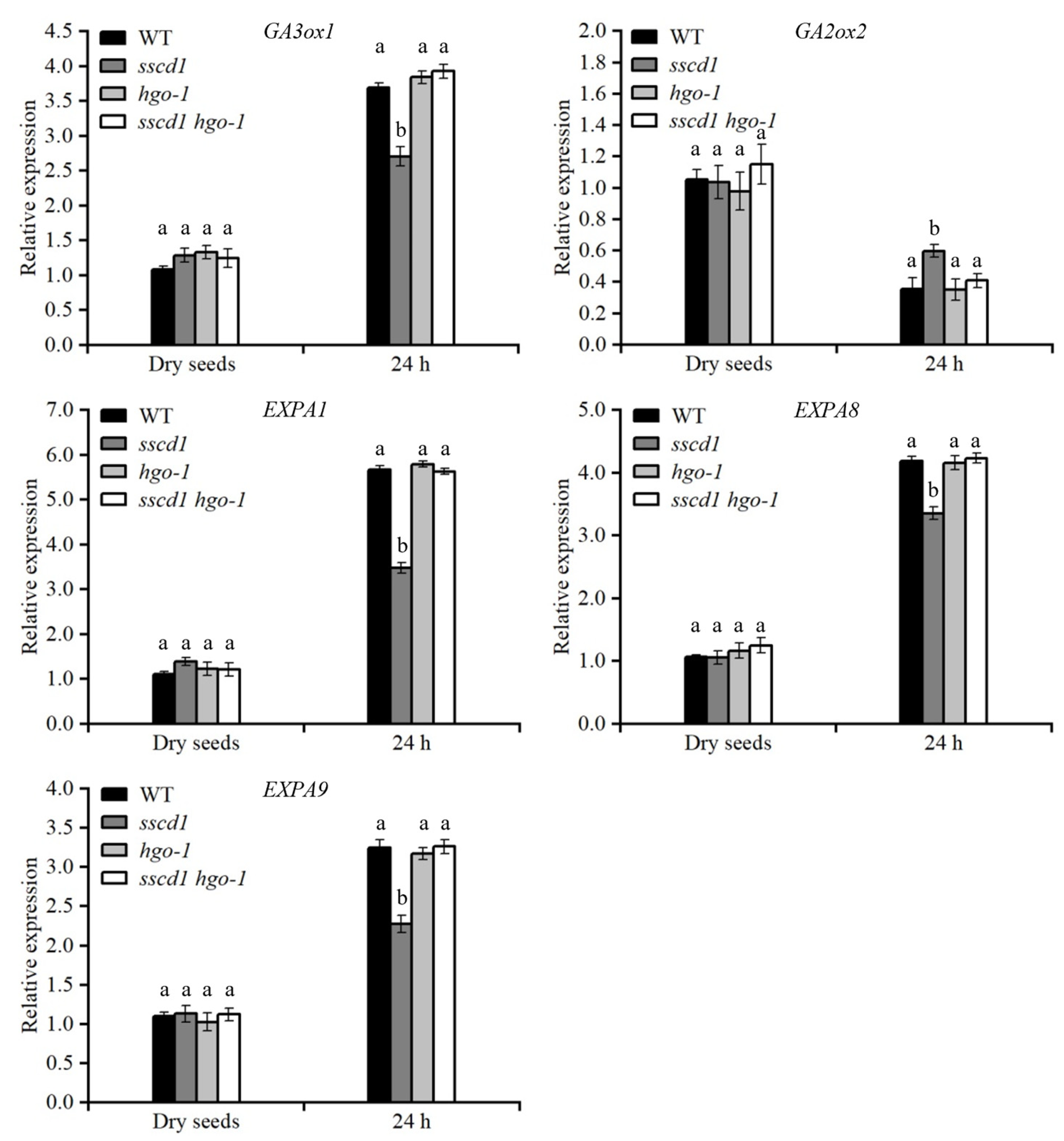 Figure 8. HGO mutation suppressed the effect of sscd1 mutation on gene expression in the GA pathway. Relative expression of genes involved in GA biosynthesis (GA3ox1), catabolism (GA2ox2) and cell wall extension (EXPA1, EXPA8, EXPA9) in freshly harvested dry seeds and seeds imbibed for 24 h on MS medium from WT, sscd1, hgo-1, and sscd1 hgo-1 plants. GA3ox1, GA3-oxidase 1. GA2ox2, GA2-oxidase 2. EXPA1, expansin A1. EXPA8, expansin A8. EXPA9, expansin A9. Data represent the mean ± SE from three biological replicates. Different letters indicate significant differences between the genotypes (one-way ANOVA with Tukey’s post hoc test, p < 0.05).
