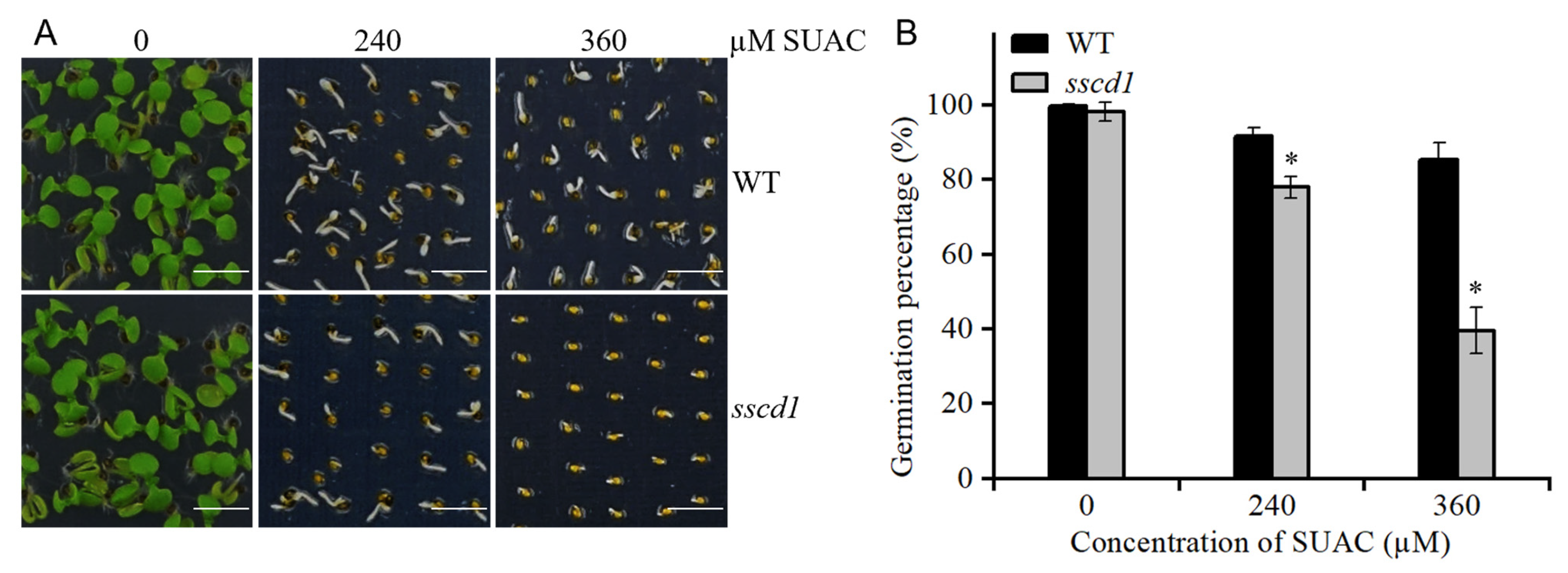 Figure 9. The sscd1 mutant was hypersensitive to succinylacetone (SUAC) during germination. (A) Germination phenotypes of WT and sscd1 seeds after 60 days of storage on the 6th day after stratification in the presence of different SUAC concentrations. Scale bars = 2.78 mm. (B) Germination percentages of WT and sscd1 seeds described in (A). Data represent the mean ± SE from three biological replicates. Seeds were pooled from at least 10 plants, and at least 50 seeds per genotype were used in each replicate. Asterisks represent significant differences between the WT and sscd1 (t-test, * p < 0.05).