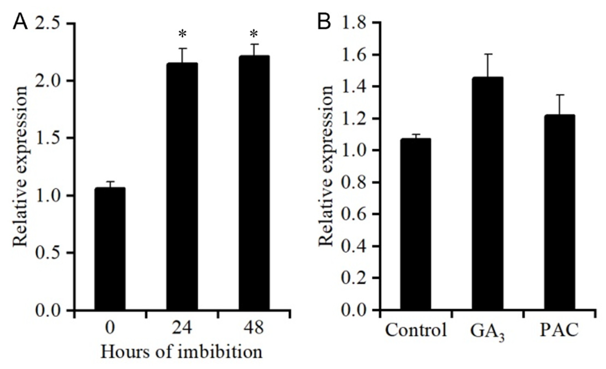 Figure 10. Analysis of SSCD1 expression. (A) Relative expression of SSCD1 during imbibition. Freshly harvested dry seeds were placed on MS medium for 24 and 48 h at 23 °C. Asterisks represent significant differences compared to dry seeds (0 h) (t-test, * p < 0.05). (B) Response of SSCD1 to exogenous GA3 or PAC in imbibed seeds. Freshly harvested dry seeds were imbibed on MS medium without (control) or with 10 µM PAC or GA3 for 24 h at 23 °C. All data represent the mean ± SE from three biological replicates.