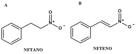 Chemical structure of 1-nitro-2-phenylethane-PubChem CID 80208 (A) and 1-phenyl-2-nitroethene-PubChem CID 5284459 (B).