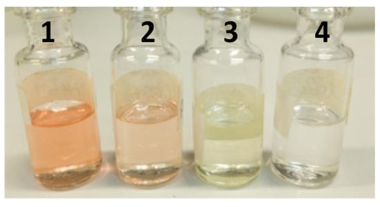 Macroscopic appearance of formulations prepared with Pluronic F-127 and the respective samples. 1: PEOANIB; 2: PNFTANE; 3: PNFTENE; 4: PBlank. Image was recorded one day after preparation and filtration through a 0.45 µm regenerated cellulose (RC) membrane filter.