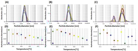 Particle size distribution of the formulations PEOANIB (A), PNFTANE (B) and PNFTENE (C). Variation in hydrodynamic diameter (y) versus temperature variation (x): PEOANIB (D), PNFTANE (E) and PNFTENE (F).