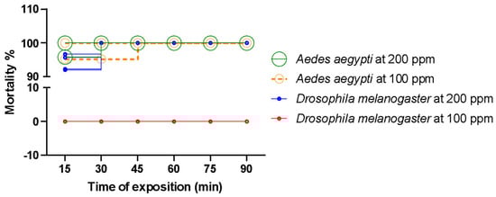 Selectivity assays using Drosophila melanogaster revealed a toxicity profile distinct from that observed in Aedes aegypti. At a concentration of 200 ppm, 100% mortality was observed in D. melanogaster after 90 min of exposure, whereas no mortality was detected at 100 ppm. In contrast, A. aegypti exhibited 100% mortality at both tested concentrations (Figure 4).