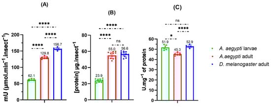 Enzyme activity, protein amounts, specific activities in Aedes aegypti larvae and adults and Drosophila melanogaster adults. Amount of acetylcholinesterase enzyme per insect (A), Amount of total proteins/insect (B), Specific activity (C). Samples were subjected to analysis of variance (ANOVA) followed by unpaired Tukey’s test. * (p value < 0.05), **** (p value < 0.0001), ns (p value > 0.05). Positive controls were performed with the commercial enzyme from Electrophorus electricus.