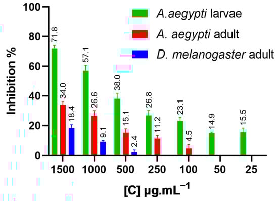 Prior to performing the enzymatic inhibition experiments, protein content in insect homogenates of Aedes aegypti and Drosophila melanogaster was quantified to estimate the specific activity (U mg−1) of AChE. The assays showed that D. melanogaster expresses approximately 53.0 U of acetylcholinesterase per milligram of total protein, whereas A. aegypti adults and larvae exhibit 45.3 and 51.9.1 U mg−1, respectively (Figure 5).
