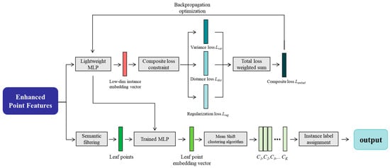 - Instance-Aware Clustering Head (IACH): The network ultimately outputs instance-aware feature embeddings for each point through this clustering head. Unlike simple clustering, this module is guided by a loss function that ensures points from the same instance are highly compact in the feature space, while those from different instances are distinctly separated, enabling accurate and automatic instance segmentation.