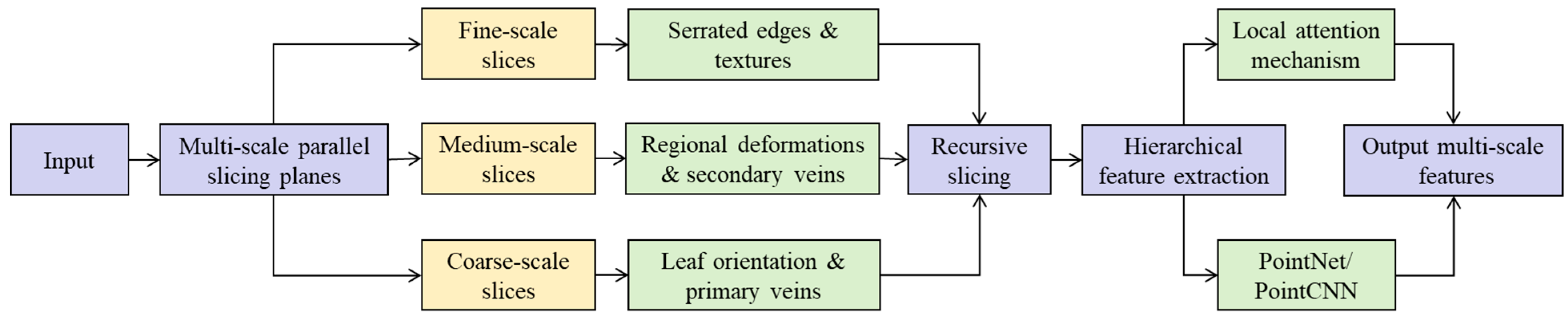 - Multi-scale Recursive Slicing Module (MRSM): This module simulates the process of “examining” local structures from multiple perspectives. It recursively slices the point cloud using multiple orthogonal planes across multi-scale spaces and employs a lightweight sub-network to extract rich local geometric features from each slice. This strategy efficiently and focusedly captures details of key regions such as leaf margins and tips.