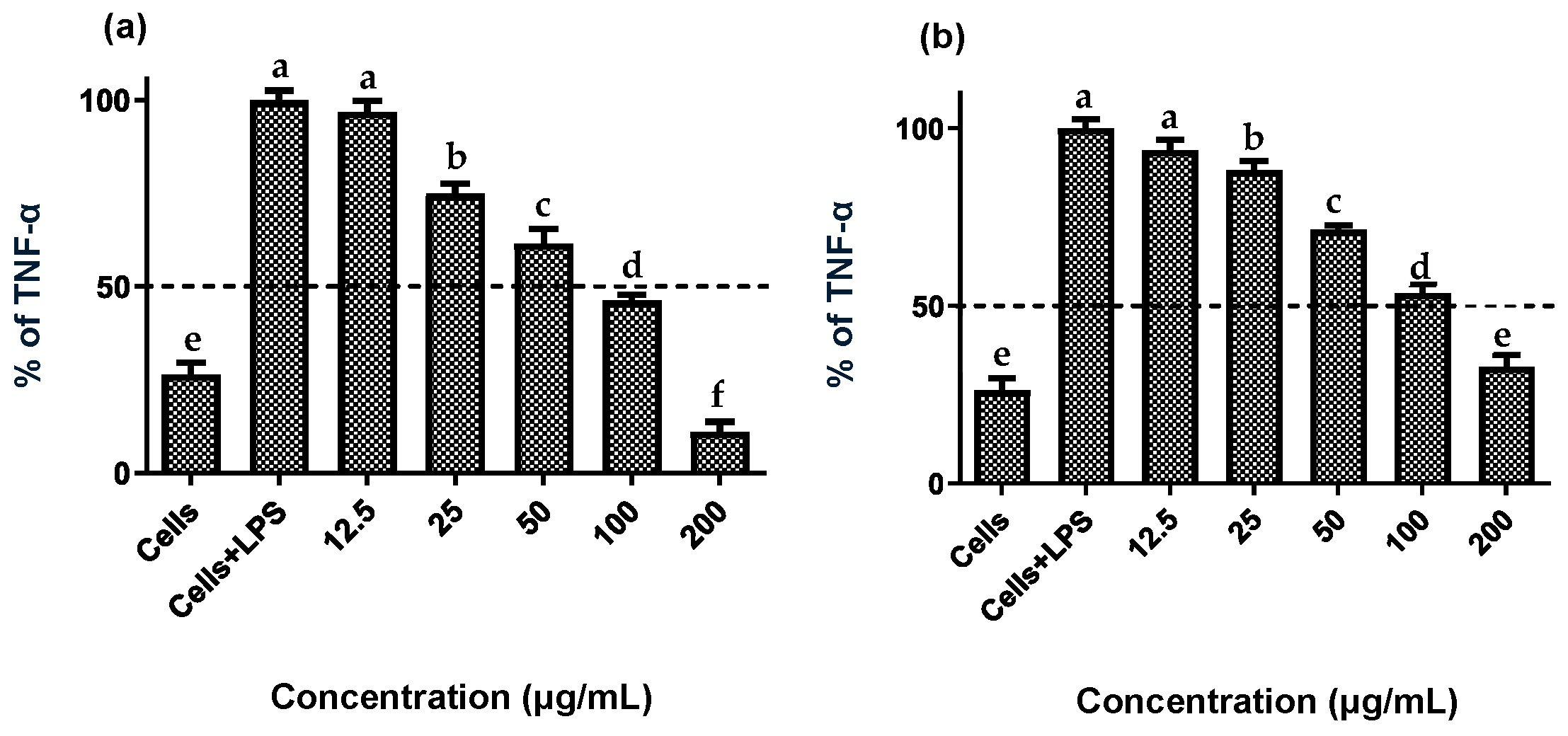 | Extract | NO (μg/mL) | TNF-α (μg/mL) |