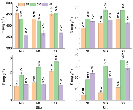 C, N, P, and K concentrations in ABs of three dominant shrubs at three sampling sites in the southeastern Gurbantunggut Desert, China. NS: north site (Cainan); MS: middle site (Guanlichu); SS: south site (Beishawo). EP: Ephedra przewalskii; CM: Calligonum mongolicum; HP: Haloxylon persicum. Different lowercase letters indicate significant (p < 0.05) differences between different species at the same site, and different capital letters presented indicate significant (p < 0.05) differences between different sites of the same species.