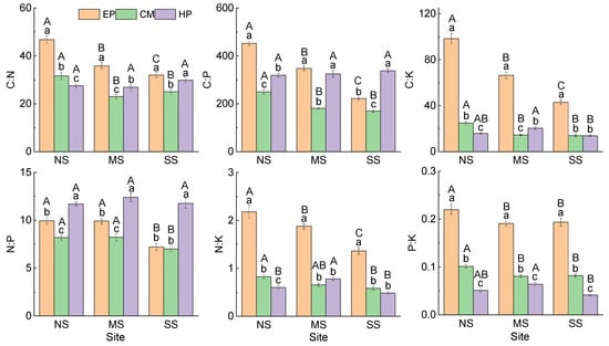 Stoichiometric ratios in ABs of three dominant shrubs at three sampling sites in the southeastern Gurbantunggut Desert, China. NS: north site (Cainan); MS: middle site (Guanlichu); SS: south site (Beishawo). EP: Ephedra przewalskii; CM: Calligonum mongolicum; HP: Haloxylon persicum. Different lowercase letters presented indicate significant (p < 0.05) differences between different species at the same site, and different capital letters indicate significant (p < 0.05) differences between different sites of the same species.