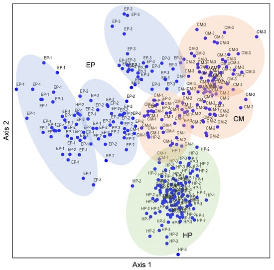 Furthermore, the NMDS result for EP showed that the proportions of variance that accounted for the ordination axes were 74.9% for Axis 1 and 22.3% for Axis 2, accounting for 97.2% of the total variation (Table S2). For CM, the proportions of variance that accounted for the ordination axes were 75.8% for Axis 1 and 3.8% for Axis 2, accounting for 79.6% of the total variation. However, no NMDS result was obtained for HP, indicating that the stoichiometric traits were little affected by surface soil factors (Figure S1). For EP, the distribution patterns of individual plants at three sampling sites in this NMDS biplot were similar to that of the stoichiometric matrix alone (see Figure 3); that is, sites NS, MS, and SS were sequentially distributed from the bottom left to the top right. Soil coarse-sand content was significantly negatively correlated with the sorting axis, and the other 11 soil factors were significantly positively correlated with both axes, indicating that the improvements in soil nutrients and environment contributed to the nutrient enrichment in ABs in EP. By contrast, the distribution of CM individuals was relatively scattered, but the relationship with soil properties was similar to that of EP, except that the influence strength of soil factors (correlation coefficients) was relatively smaller (Table S2). This result also indicated that the nutrients in ABs of EP, which had a smaller body size, were more affected by the soil.
