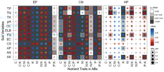 Plots of correlation coefficients between soil variables and nutrient traits in ABs of three dominant shrubs at three sampling sites in the southeastern Gurbantunggut Desert, China. Abs_cor represents the absolute value of the correlation coefficient (0 = no association, 1 = perfect association), quantifying the strength of linear relationships while ignoring directionality, with effect sizes interpreted using Cohen’s benchmark (0.1 = weak, 0.4 = strong). The color gradient from blue to red corresponds to the shift from positive to negative correlations between nutrient traits in ABs and soil variables. EP: Ephedra przewalskii; CM: Calligonum mongolicum; HP: Haloxylon persicum. OC: soil organic carbon content; TN: soil total nitrogen content; TP: soil total phosphorus content; TK: soil total potassium content; AN: soil available nitrogen content; AP: soil available phosphorus content; AK: soil available potassium content; EC: soil electrical conductivity; DLB: developmental level of biocrust; FS: fine-sand content; CS: coarse-sand content.