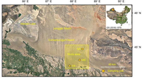 At the beginning of September 2021, three study sites, Cainan (denoted as the north site, NS; 44.945° N, 88.393° E), Guanlichu (denoted as the middle site, MS; 44.616° N, 88.266° E), and Beishawo (denoted as the south site, SS; 44.470° N, 87.923° E), were selected, and EP, CM, and HP were well distributed together here. The distance between NS and MS is 38 km, the distance between MS and SS is 31 km, and the distance between NS and SS is 65 km (Figure 6). Based on years of observation, the climatic conditions (including mean annual temperature, mean annual precipitation, solar radiation, potential evapotranspiration, aridity index, soil water content, and soil temperature) of the three sampling sites are basically the same (the detectable rainfall [>0.2 mm] per year was 66.7 mm; the depth of snowfall was approximately 13–15 mm), but there are great differences in the soils’ physical and chemical properties, and differences in soil particle size and biocrust development level are, at most levels, clear [81,82].