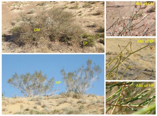 Individuals and ABs of three dominant shrubs in the southeastern Gurbantunggut Desert, China. EP: Ephedra przewalskii; CM: Calligonum mongolicum; HP: Haloxylon persicum.