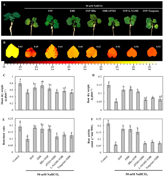Effects of EBR and NO on the growth of cucumber seedlings under NaHCO3 stress. (A) Phenotypic appearance of seedlings after 8 days of exposure; (B) chlorophyll fluorescence images showing the maximum quantum efficiency of photosystem II (Fv/Fm); (C) shoot dry weight; (D) root dry weight; (E) root-to-shoot ratio; (F) root activity. Different lowercase letters indicate statistically significant differences among treatments at the 0.05 level (p < 0.05, n = 3). Note that changes to the position of figures and tables may occur during the final steps.