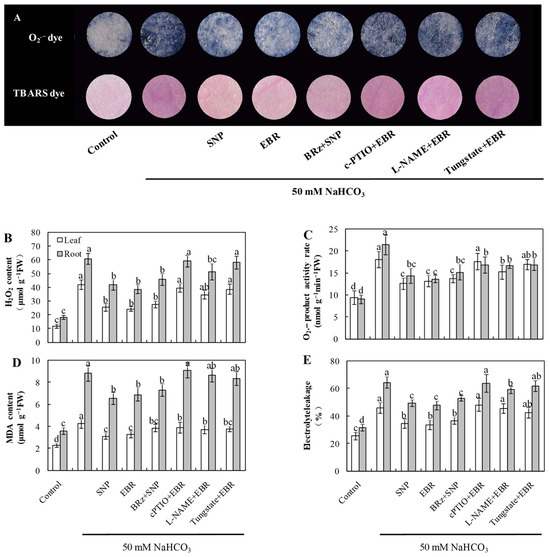 As shown in Figure 2, NaHCO3 exposure led to a marked rise in the levels of O2−, H2O2, and MDA, accompanied by increased electrolyte leakage in both roots and leaves. The addition of EBR and NO markedly reduced ROS and MDA accumulation and decreased EL compared with NaHCO3 treatment alone. Notably, the EBR-induced reductions in O2− and H2O2 levels were largely reversed or markedly weakened by cPTIO, L-NAME, or tungstate, whereas BRz treatment had minimal influence on the NO-mediated decreases in O2− and H2O2 concentrations under NaHCO3 stress. Histochemical staining of ROS and TBARS in cucumber leaves further corroborated these biochemical results (Figure 2A). These observations support the possibility that NO acts as a downstream component in BR-dependent regulation of ROS detoxification in cucumber seedlings under alkaline stress.