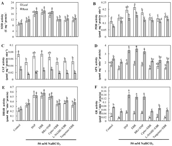 Effects of exogenous EBR and NO on antioxidant enzyme activities in cucumber seedlings under NaHCO3 stress. (A) Superoxide dismutase (SOD); (B) Peroxidase (POD); (C) Catalase (CAT); (D) Ascorbate peroxidase (APX); (E) Dehydroascorbate reductase (DHAR); (F) Glutathione reductase (GR). Different lowercase letters indicate statistically significant differences among treatments at the 0.05 level (p < 0.05, n = 3).