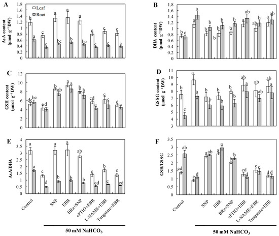 Effects of exogenous EBR and NO on the contents of non-enzymatic antioxidants in cucumber seedlings under NaHCO3 stress. (A) Ascorbic acid (AsA); (B) Dehydroascorbic acid (DHA); (C) Reduced glutathione (GSH); (D) Oxidized glutathione (GSSG); (E) AsA/DHA ratio; (F) GSH/GSSG ratio. Different lowercase letters indicate statistically significant differences among treatments at the 0.05 level (p < 0.05, n = 3).
