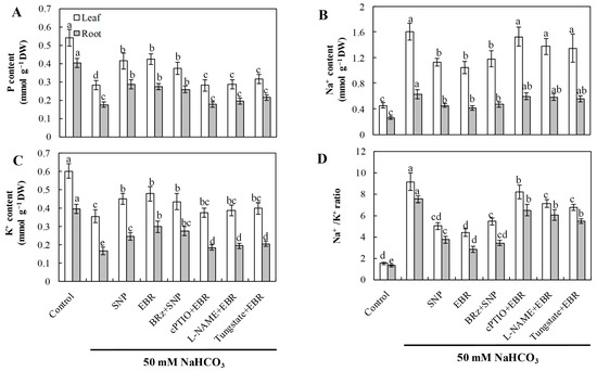 Effects of exogenous EBR and NO on ion homeostasis in cucumber seedlings exposed to NaHCO3 stress. (A) Phosphorus (P); (B) sodium (Na+); (C) potassium (K+); (D) Na+/K+ ratio in leaves and roots. Different lowercase letters indicate statistically significant differences among treatments at the 0.05 level (p < 0.05, n = 3).