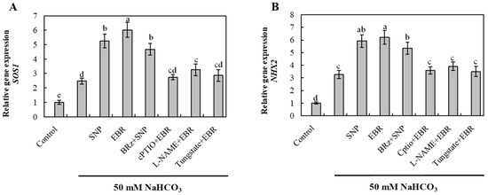 Effects of exogenous EBR and NO on the expression of Na+ detoxification-related genes in cucumber roots under NaHCO3 stress. (A) Salt overly sensitive 1 (SOS1); (B) Na+/H+ exchanger 2 (NHX2). Different lowercase letters indicate statistically significant differences among treatments at the 0.05 level (p < 0.05, n = 3).