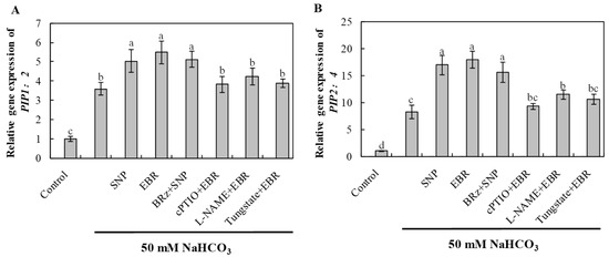 Effects of exogenous EBR and NO on aquaporin gene expression in cucumber roots under NaHCO3 stress. (A) PIP1;2; (B) PIP2;4 after 16 h of treatment. Different lowercase letters indicate statistically significant differences among treatments at the 0.05 level (p < 0.05, n = 3).
