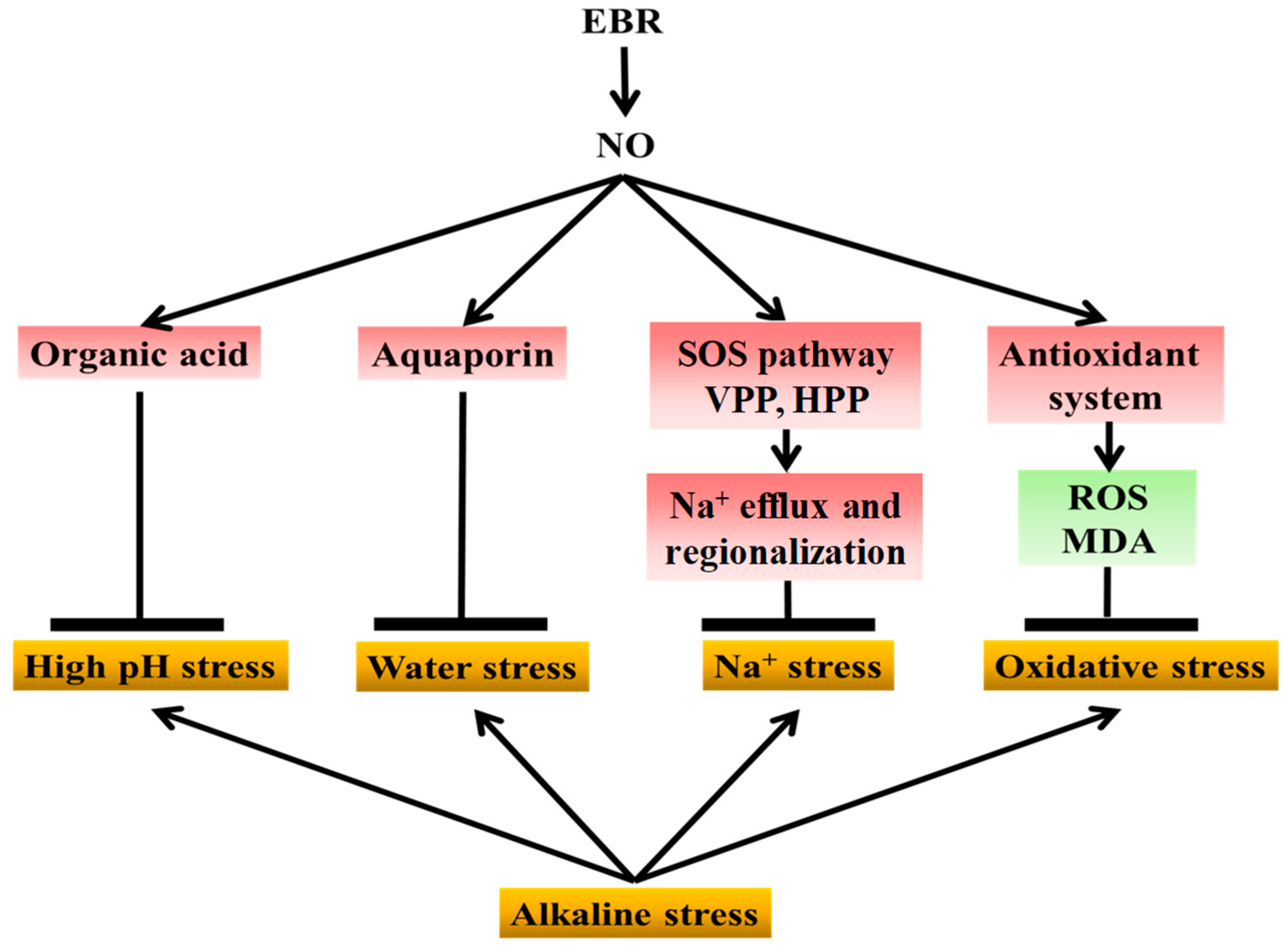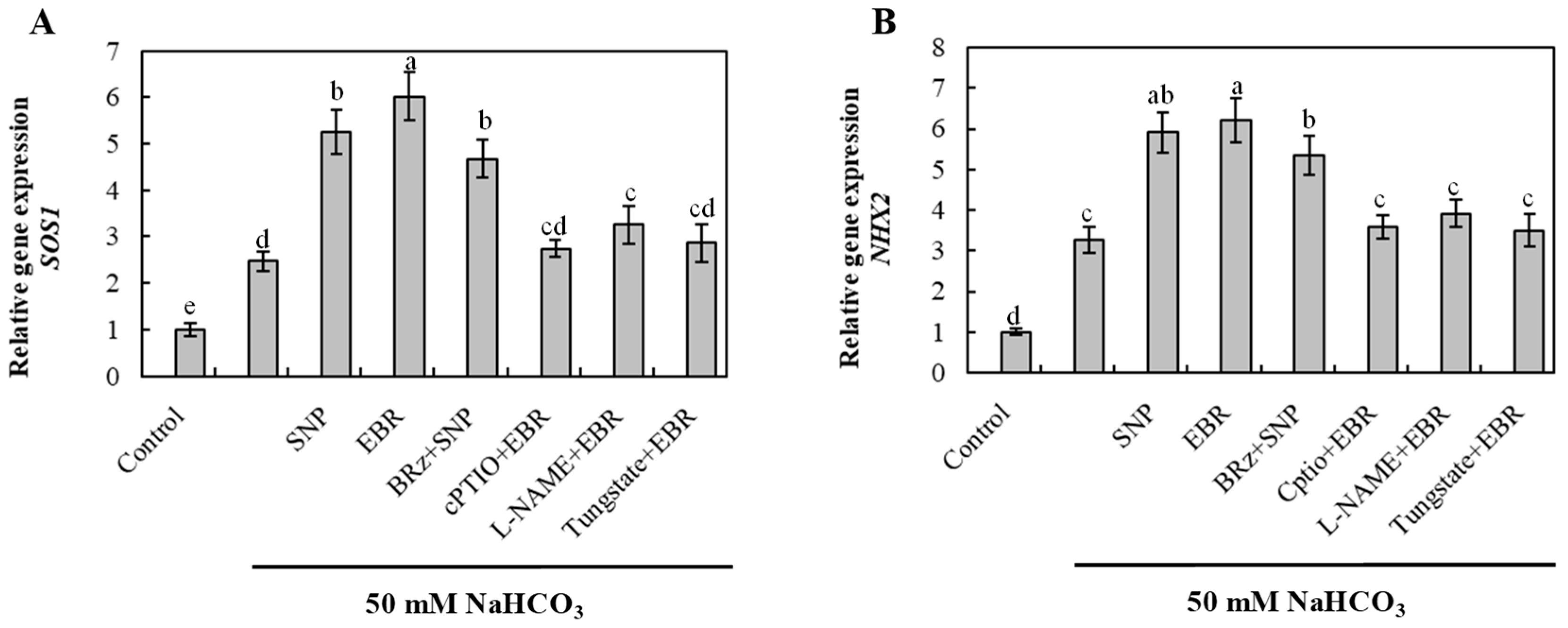 2.7. EBR and NO Upregulate Na+ Detoxification-Related Genes Under NaHCO3 Stress