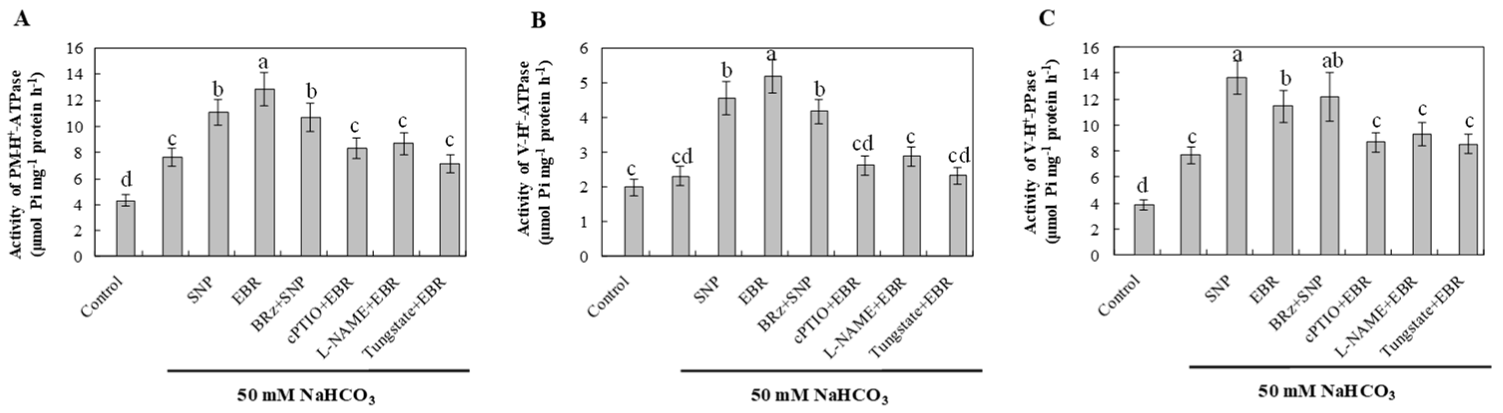 2.8. EBR and NO Enhance H+-Pump Activities Under NaHCO3 Stress