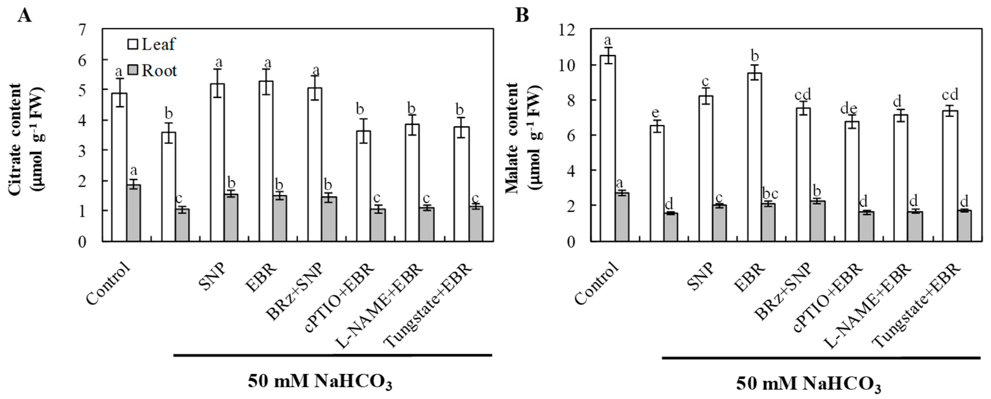 - NaHCO3 + BRz + SNP—50 mM NaHCO3 with 100 μM SNP and 4 μM brassinazole (BRz, a BR biosynthesis inhibitor).