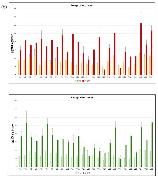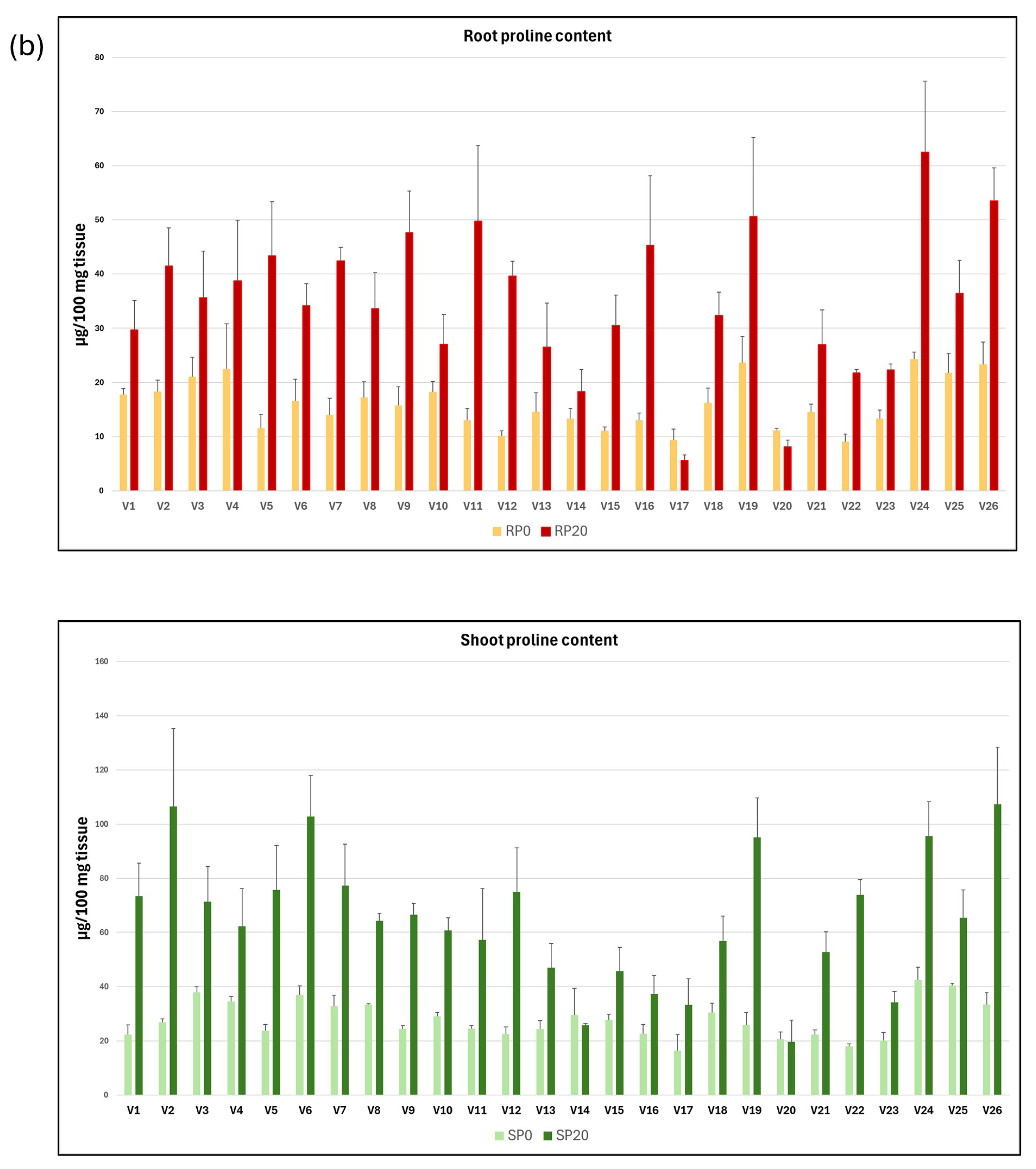 - Arteaga, S.; Yabor, L.; Díez, M.J.; Prohens, J.; Boscaiu, M.; Vicente, O. The Use of Proline in Screening for Tolerance to Drought and Salinity in Common Bean (Phaseolus vulgaris L.) Genotypes. Agronomy 2020, 10, 817. [Google Scholar] [CrossRef]