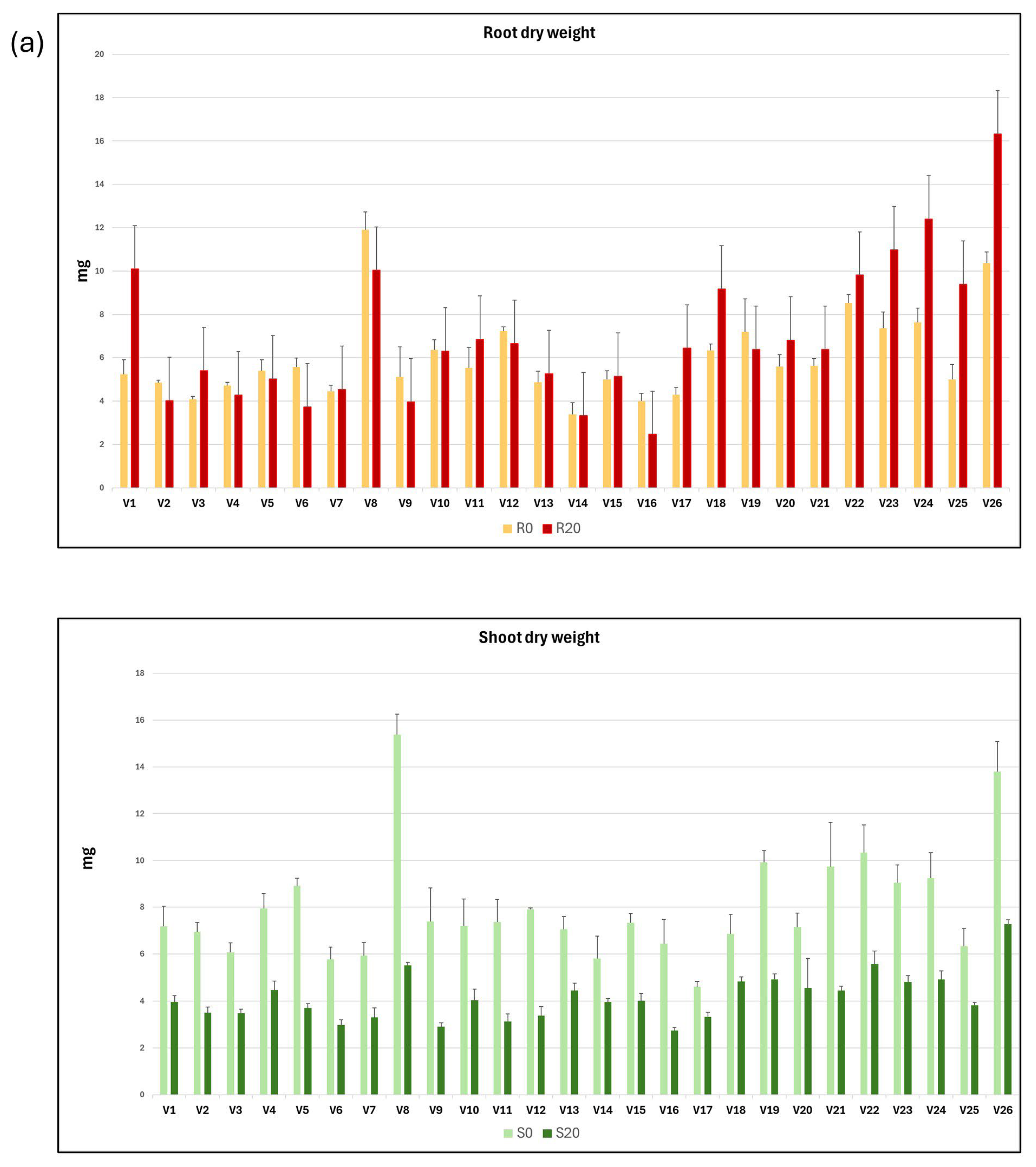 2.1. Genotypic Variation in Root and Shoot Biomass Under Osmotic Stress