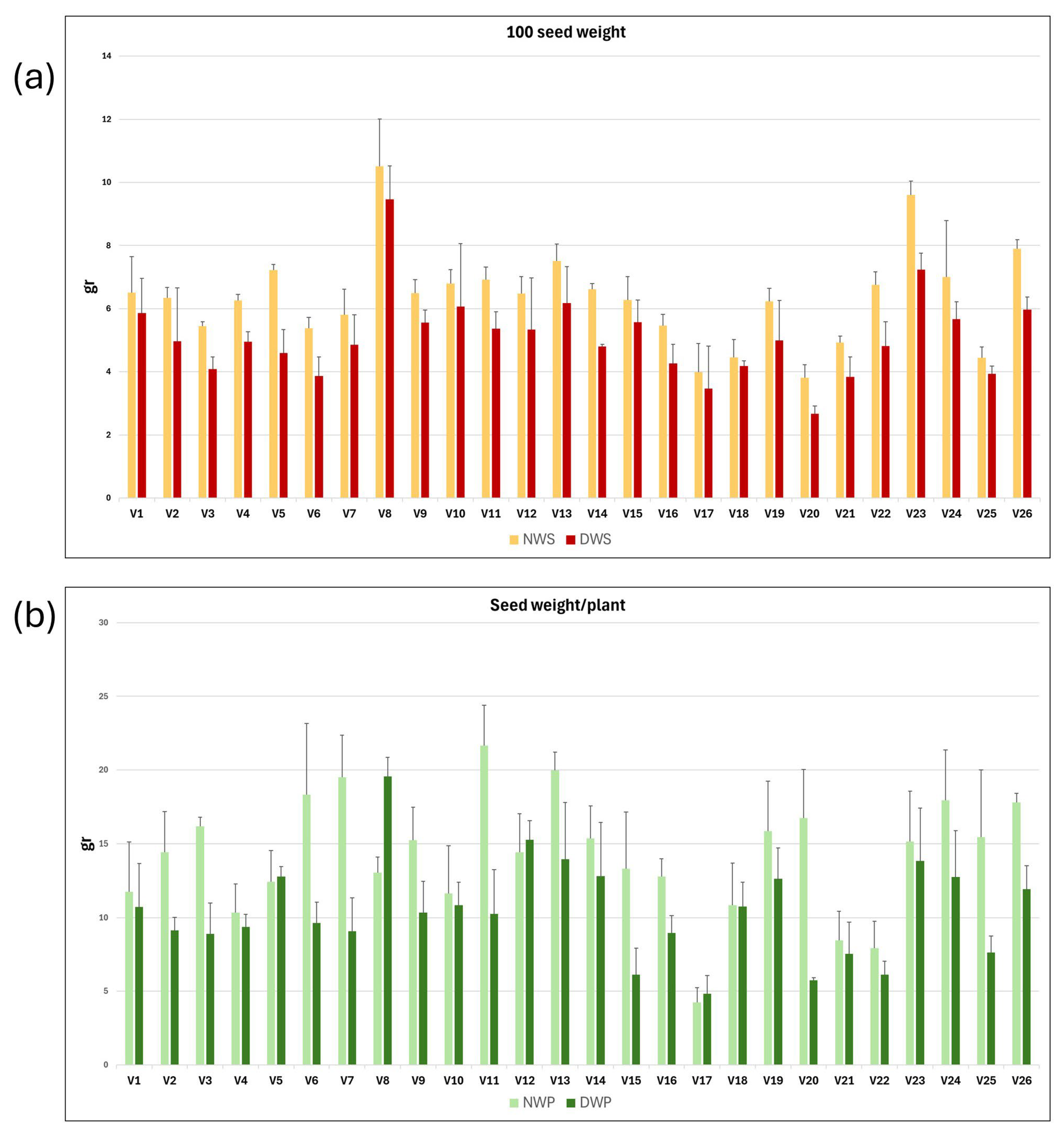 - Alicandri, E.; Badiani, E.; Paolacci, A.R.; Lo Presti, E.; Caridi, R.; Rea, R.; Pati, F.; Badiani, M.; Ciaffi, M.; Sorgonà, A. Screening for Drought Tolerance Within a Common Bean (Phaseolus vulgaris L.) Landrace Accessions Core Collection from the Lazio Region of Italy. Plants 2024, 13, 3132. [Google Scholar] [CrossRef] [PubMed]