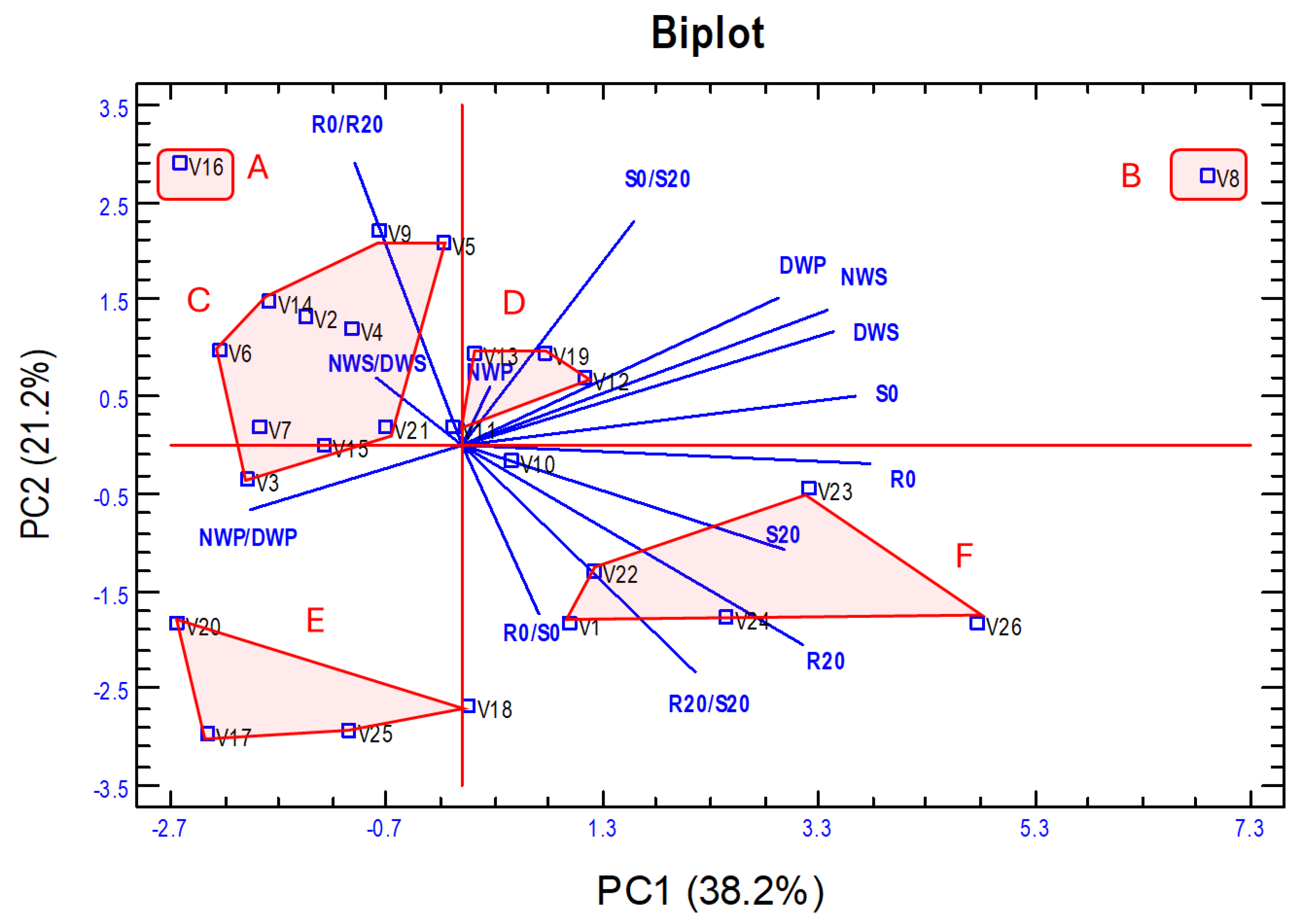 2.5. PCA Grouped Vetch Genotypes by Contrasting Biomass Production and Drought Tolerance