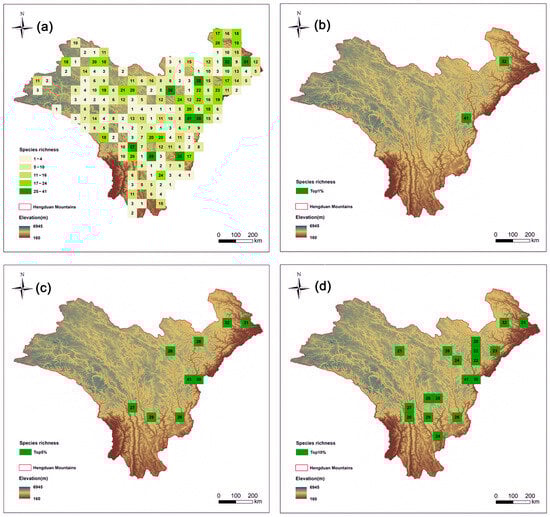 Species richness patterns of Artemisia species in the Hengduan Mountains. Spatial patterns of (a) species richness (the number is value for richness); (b) the top 1% of grid cells with the highest species richness of Artemisia species in the Hengduan Mountains; (c) the top 5% of grid cells with the highest species richness; and (d) the top 10% of grid cells with the highest species richness.