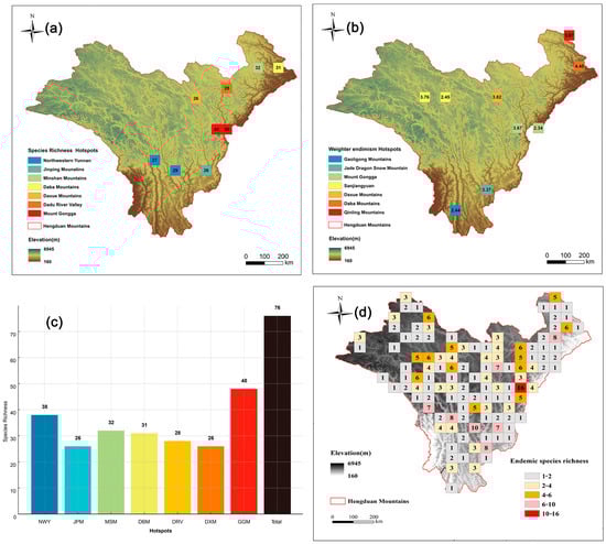 Hotspots of Artemisia species richness. (a) The nine (top 5%) highest–richness grid cells (we grouped these nine grid cells into seven geographically distinct biodiversity hotspots). (b) The nine (top 5%) highest–endemism grid cells. (c) Species richness of each hotspot region (NWY = Northwestern Yunnan; JPM = Jinping Mountains; MSM = Minshan Mounatains; DBM = Daba Mounatins; DXM = Daxue Mountains; DRV = Dadu River Valley; GGM= Mount Gongga). (d) Distribution pattern of endemic species richness (the numbers indicate endemic species richness).