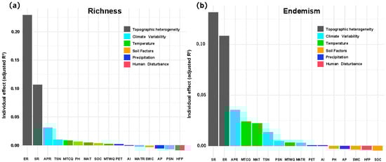 Relative importance of environmental predictors derived from GAM hierarchical partitioning. (a) Artemisia species richness and (b) weighted endemism across the Hengduan Mountain grid cells. Topographic heterogeneity (ER = elevation range; SR = surface roughness), climate variability (APR = annual precipitation range; TSN = temperature seasonality; PSN = precipitation seasonality; MATR = spatial range in mean annual temperature), temperature (MTCQ = mean temperature of the coldest quarter; MTWQ = mean temperature of the warmest quarter; MAT = mean annual temperature), soil factors (SOC = soil organic carbon stock; SWC = soil water capacity; pH), precipitation (AP = annual precipitation; PET = potential evapotranspiration; AI = aridity index), and human disturbance (HFP = Human Footprint Index).