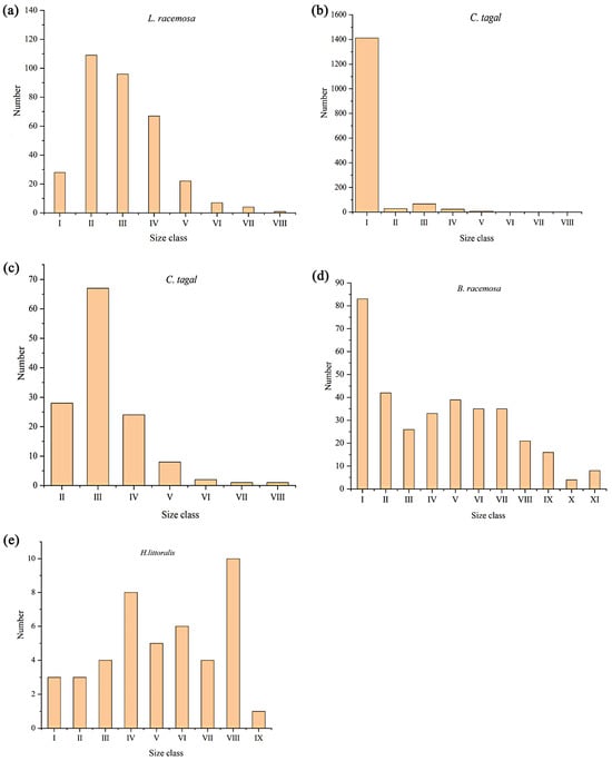 The space-for-time substitution method was used, with the diameter class structure of L. racemosa replacing the age class structure. Individuals in age class I account for 8.4% of the total population. The total population gradually decreases with increasing age class beyond age class II, with the highest numbers of individuals in age classes II and III, at 109 and 96 individuals, respectively, accounting for 61.4% of the total population. Individuals in age classes IV to V make up 26.6%, while those in age classes VI to VIII account for 3.6%. A noticeable decrease in numbers occurs during the transition between age classes IV and V (Figure 3a). The number of C. tagal seedlings is high (1411 individuals), constituting 91.50% of the total population. To offer a clearer understanding of the population structure of C. tagal, excluding age class I, Figure 3b shows the age structure after excluding class I. It is evident that, after removing class I, age class III has the largest number of individuals (67 individuals), accounting for 4.35% of the total population. Age class II has 28 individuals (1.82% of the total), and individuals in age classes IV to VIII are fewer, together comprising 2.33% of the total (Figure 3c). In B. racemosa, the largest number of individuals is found in age class I (83 individuals), making up 24.27% of the total survey sample. This is followed by age class II with 39 individuals (11.40%), age classes III to V with 98 individuals (28.65%), and age classes VI to VIII with 91 individuals (26.61%). Individuals in age classes IX to XI total 28 individuals, accounting for 8.19% (Figure 3d). The number of young H. littoralis individuals in age class I is the smallest (3 individuals), accounting for 6.8%, all having a chest diameter greater than 3.5 cm. Individuals in age classes II to V account for 45.5% of the total population, while those in age classes VI to IX account for 47.7% (Figure 3e).