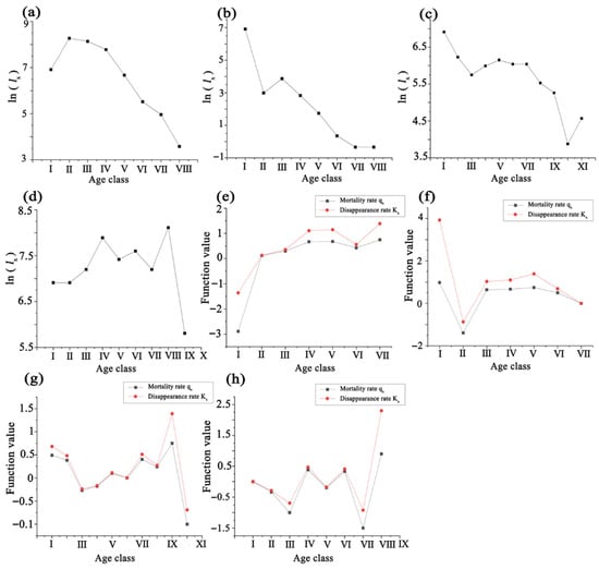 The mortality rate curve of the L. racemosa population mirrors the trend of the disappearance rate curve (Figure 4e). A significant increase is observed from age class I to II, followed by a slower rise as the population stabilizes. The mortality rate in age class V is 0.68, while the disappearance rate is 1.15. The maximum values occur in age class VII, with a mortality rate of 0.75 and a disappearance rate of 1.39. Overall, both mortality and disappearance rates exhibit a rising–falling–rising pattern.