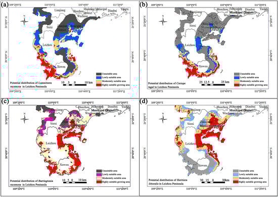 The species presence probability maps of the four endangered wild mangrove species, obtained from the MaxEnt model, were imported into ArcGIS Pro 2.9 and converted into raster data. Reclassification was performed using the natural breaks classification method to delineate the potential suitable distribution areas for the species. The potential suitable distribution area for L. racemosa is primarily located in the southern part of the Leizhou Peninsula, including suitable habitats in Xuwen County and Leizhou City, such as Qindou Town, Xilian Town, Maichen Town, Yingli Town, Liusha Bay, Xinliao Town, and Dongsonghai (Figure 6a). The potential distribution area of C. tagal overlaps with that of L. racemosa to some extent but is situated further south, with its northern boundary lower than that of L. racemosa. It is primarily distributed in a belt-like pattern across the southern part of the Leizhou Peninsula, including Xilian Town, Maichen Town, Liusha Bay, Qianshan Town, Xinliao Town, and Duzigang, where theoretical potential planting areas for C. tagal are located (Figure 6b).