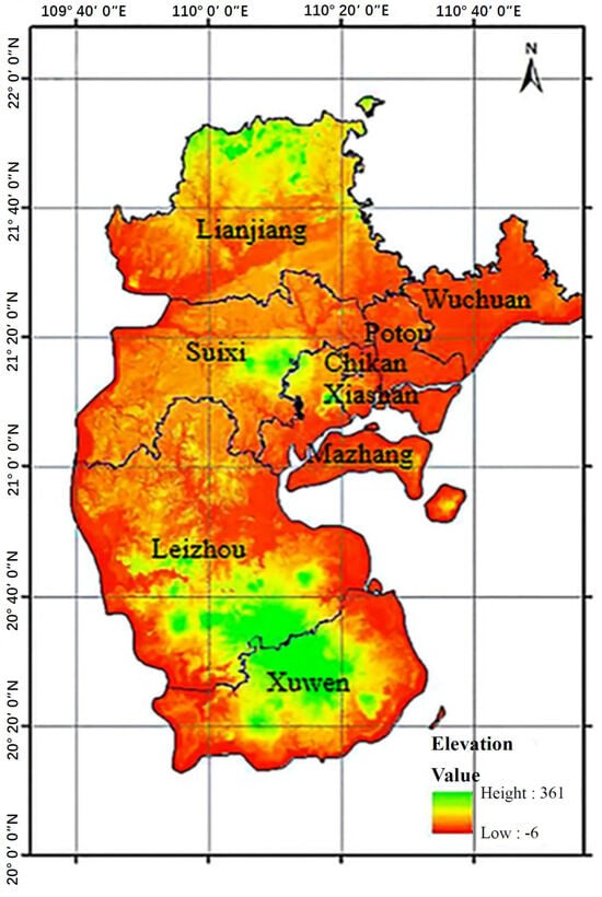 Location and elevation map of the Leizhou Peninsula, Guangdong Province, China. The map uses the WGS84 coordinate system.